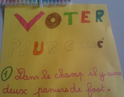 Beaucoup de candidats se présentent dans notre classe ! Il est maintenant difficile d'établir un programme pour emporter l'adhésion de chacun.Des idées intéressantes , d'autres beaucoup trop ludiques pour une école ......Le vote aura lieu mardi prochain.