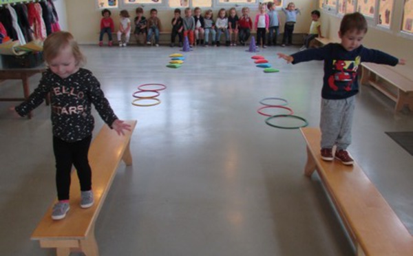 Nous aimons beaucoup nous retrouver dans la salle de motricité pour le sport. Chacun prend son tour pour réaliser le parcours, dans le bon ordre.