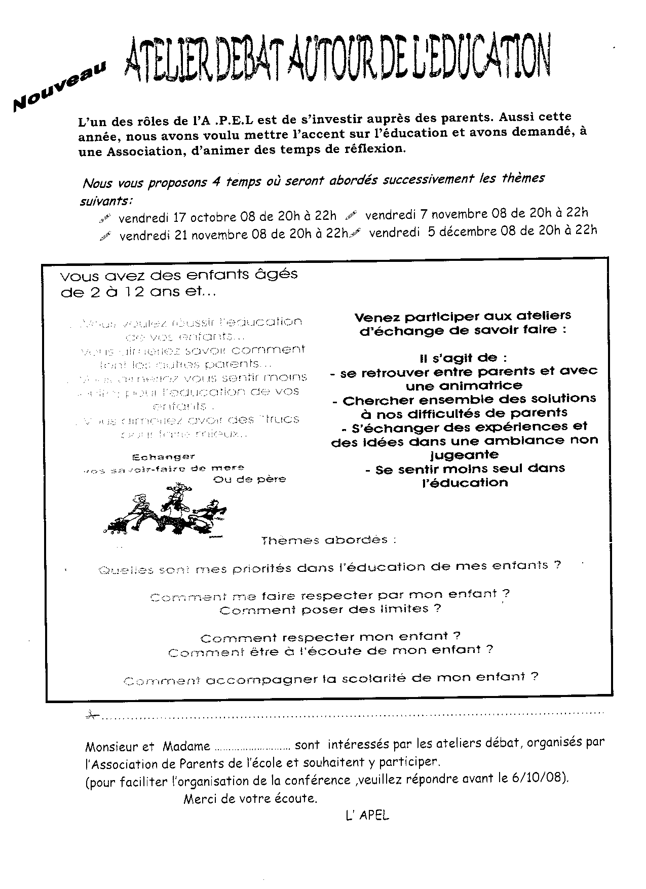 Interrogés par sondage sur notre site Internet , vous avez souhaité que l'APEL organise une conférence sur l'éducation.Nous avons la possibilité d'organiser à l'école des rencontres, animées par une association ,pour débattre ensemble des thèmes comme le respect,l'écoute ou l'accompagnement scolaire.Nous vous proposons un 1er temps le vendredi 17 octobre de 20h00 à 22h00.