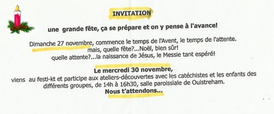 Mercredi 30 novembre , le rendez-vous Festi-kt de 14h00 à 16h30 à la salle paroissiale de Ouistreham.