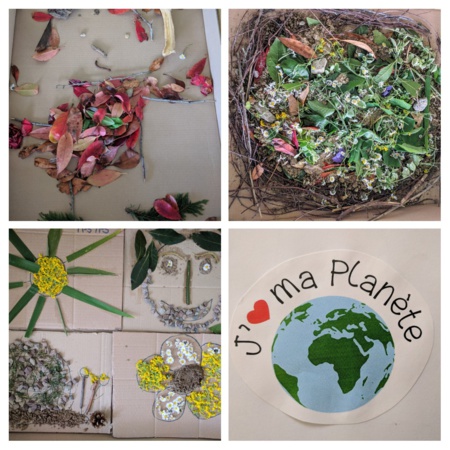 Une journée spéciale pour les 3 classes de maternelle qui ont fêté le jour de la terre : parcours sportif, couronne, récolte d'éléments naturels pour réaliser un land art .... sans oublier le goûter !